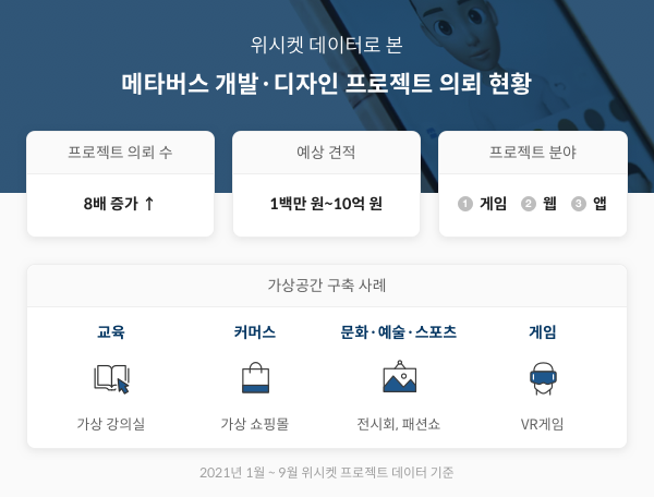 위시켓 데이터에 따르면, 2021년 9월까지 위시켓에 등록된 ‘메타버스’ 관련 IT 외주 프로젝트의 유형은 캐릭터 의상 3D 모델링, 메타버스 내의 가상공간 구축, ‘메타버스’ 플랫폼의 직접 개발 등이 있었고, 의뢰 금액은 1백만원부터 10억원까지 고르게 분포된 것으로 나타났다.
