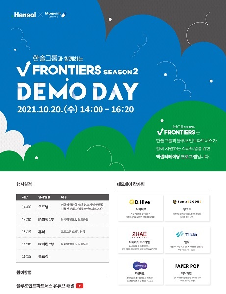 행사 관계자는 “액셀러레이팅 프로그램을 거친 6개 기술 스타트업의 솔루션부터 시장에 대한 참신한 시각까지 엿볼 수 있는 한솔 V 프론티어즈 2기 데모데이는 누구나 무료로 참여할 수 있다”며 “행사 관련 상세한 정보는 이벤터스 홈페이지나 한솔 V 프론티어즈 공식 홈페이지에서 확인하면 된다”고 전했다.