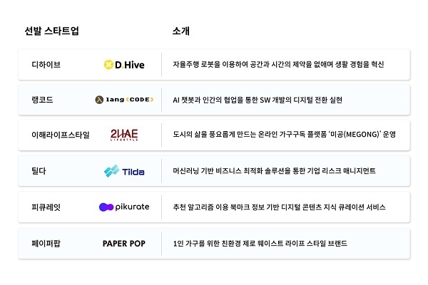 데모데이 발표에는 △디하이브(자율주행 로봇 배달) △랭코드(AI 챗봇 기반 협업 솔루션) △이해라이프스타일(온라인 가구구독 플랫폼) △틸다(머신러닝 기반 비즈니스 최적화 솔루션) △피큐레잇(지식 큐레이션 플랫폼) △페이퍼팝(친환경 제로 웨이스트 종이 가구)이 참가할 예정이다.