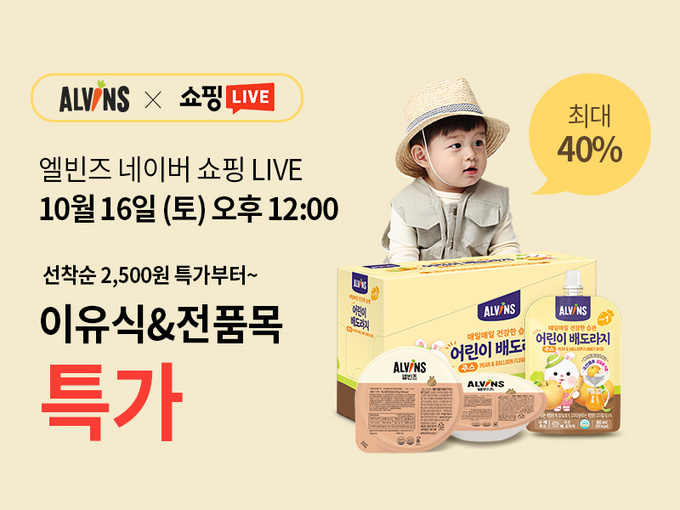 엘빈즈에 따르면 16일 낮 12시부터 90분간 진행되고 이유식과 간식, 간편반찬, 음료 등 다양한 제품을 선보이며 최대 40% 할인 판매한다.
