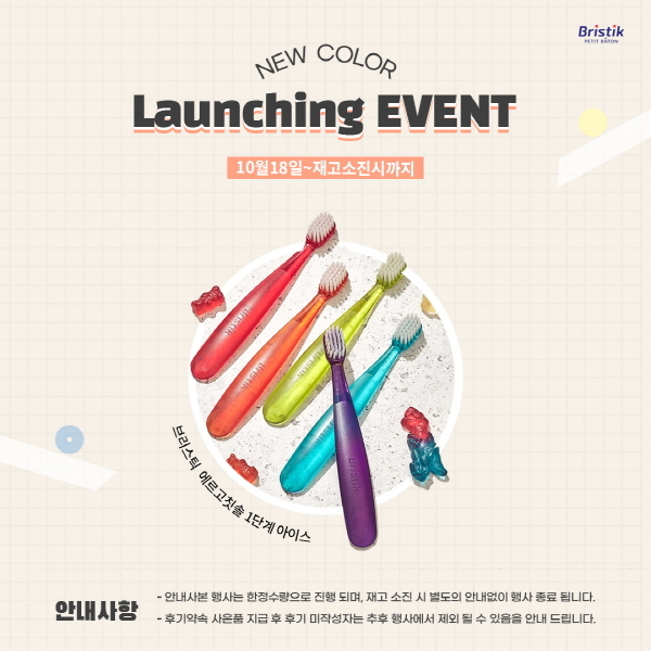 브리스틱 에르고 유아칫솔 1단계 아이스컬러 런칭 행사는 총 2개의 프로모션으로 진행된다. 첫 번째 이벤트로는 브리스틱 아이스컬러 5P세트가 런칭 특가 5천원으로 판매되며, 후기 약속 시 카가 무불소 치약 1종을 추가 증정한다.