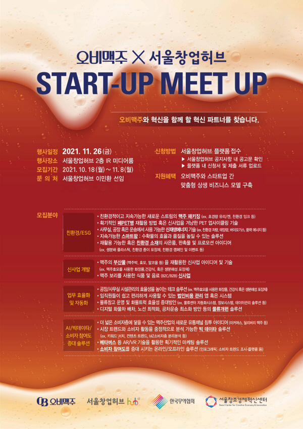 [세계비즈=박보라 기자] 서울시의 창업지원 기관인 서울창업허브(SBA 운영, 대표이사 직무대행 박대우)가 오비맥주(대표이사 배하준)와 함께 운영하는 ‘오비맥주 x SEOUL START-UP MEET-UP’ 프로그램에 참여할 스타트업을 모집한다고 19일 밝혔다.