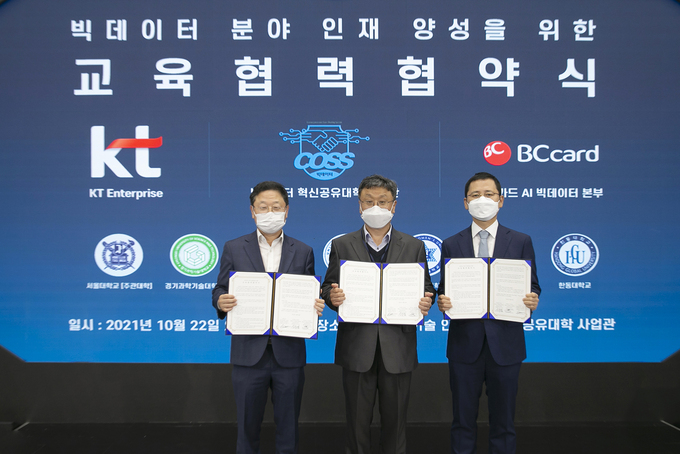 [세계비즈=권영준 기자] KT가 BC카드, 서울대학교 빅데이터 혁신공유대학 사업단과 빅데이터 분야의 신기술 인재양성과 이를 위한 교육 인프라 구축 등의 협력을 강화하는 내용의 협약을 체결했다고 24일 밝혔다.