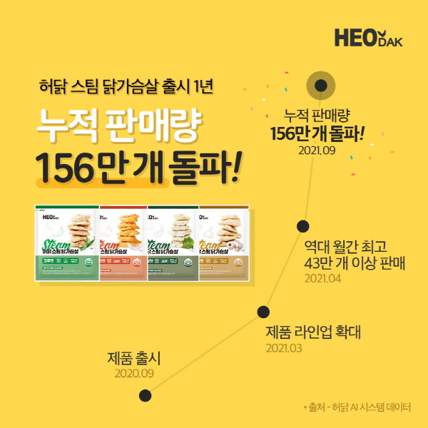 지난해 9월 출시한 허닭 스팀 닭가슴살은 수분 증발을 최소화하는 스팀 오븐 공법이 적용된 닭가슴살로, 연육제 없이도 식감이 부드럽고 촉촉하기 때문에 닭가슴살은 퍽퍽하다는 소비자의 고정관념을 깨트렸다는 것이 업체 측의 설명이다. 허닭은 초기 2종이었던 제품 라인업을 4종으로 확대했다.