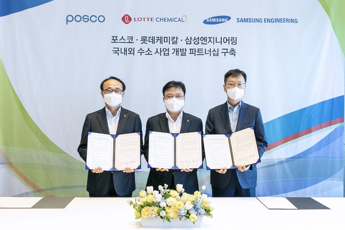 포스코는 삼성엔지니어링, 롯데케미칼과 28일 ‘국내외 수소 사업 개발을 위한 파트너십 구축’에 관한 양해각서를 체결했다고 밝혔다.