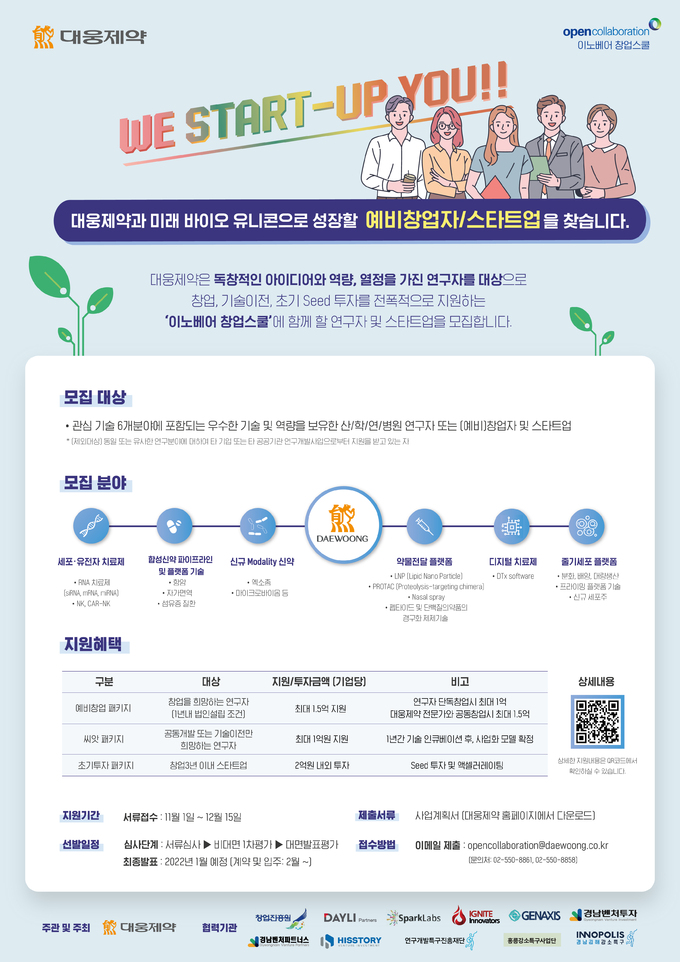 대웅제약은 서류심사와 비대면 1차 평가, 대면 발표평가를 거쳐 2022년 1월 최종 선정 대상자를 발표한다.