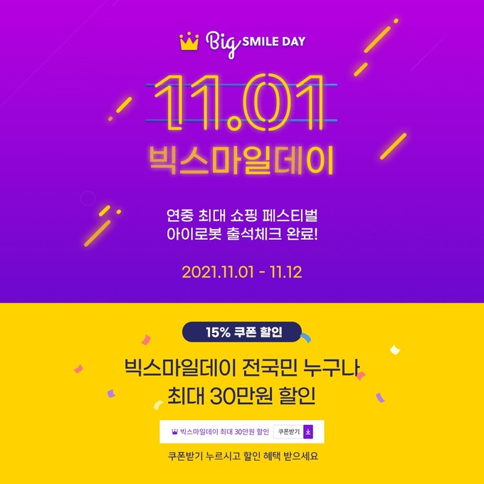 이번 빅스마일데이 행사는 이베이 운영사이트인 옥션과 지마켓을 통해 오늘(1일)부터 오는 12일까지12일간 진행되며 행사 가격에서 추가로 15% 특가 할인 쿠폰까지 적용해 프리미엄 로봇청소기인 룸바 i7+를 구매할 수 있다.