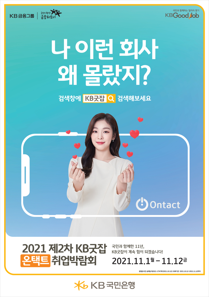 [세계비즈=오현승 기자] KB국민은행은 오는 12일까지 KB굿잡 웹사이트와 모바일 앱을 통해 ‘2021 제2차 KB굿잡 온택트 취업박람회’를 개최한다고 1일 밝혔다.
