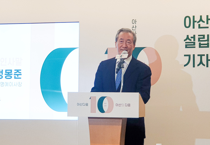 아산나눔재단이 2일 재단 설립 10주년을 맞아 기자간담회를 개최하고 그간의 성과를 발표했다. 이날 행사에는 정몽준 아산나눔재단 명예이사장, 한정화 이사장, 정남이 상임이사 등이 참석했다.
