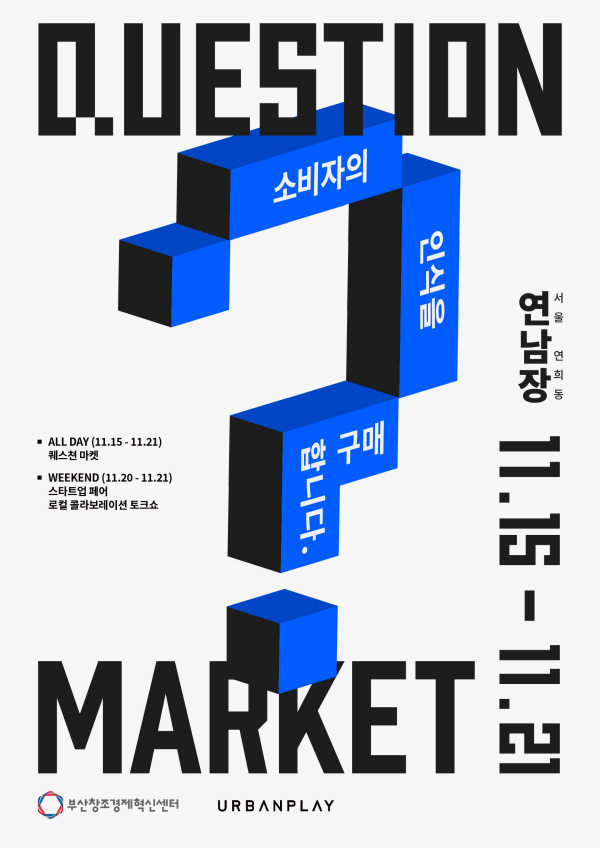[세계비즈=박혜선 기자] 부산창조경제혁신센터와 도시 콘텐츠 기업 ㈜어반플레이가 공동으로 개최하는 ‘퀘스천 마켓’ 팝업스토어 행사가 오는 15일부터 21일까지 일주일간, 어반플레이의 크리에이터 라운지 ‘연남장’에서 진행된다고 9일 밝혔다.