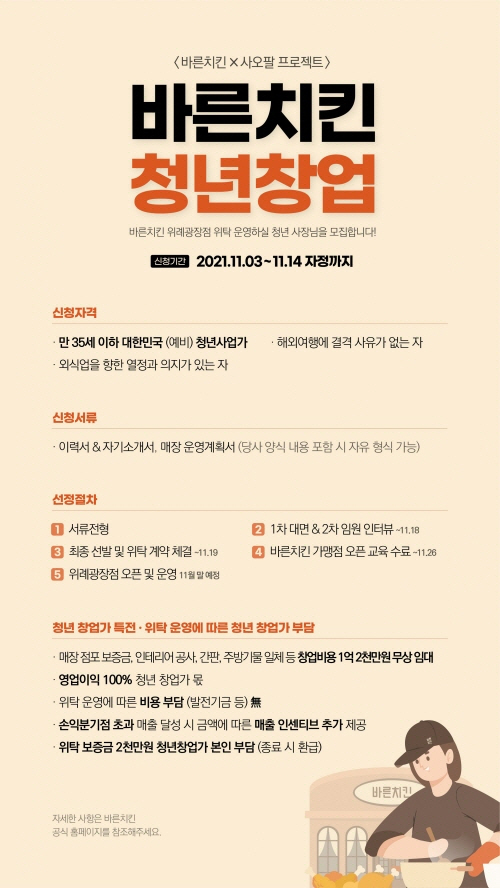 참여를 희망하는 예비 청년 창업가는 오는 14일 자정까지 바른치킨 홈페이지에서 이력서, 매장 운영계획서 등 제출 서류를 내려받아 이메일로 접수하면 된다.