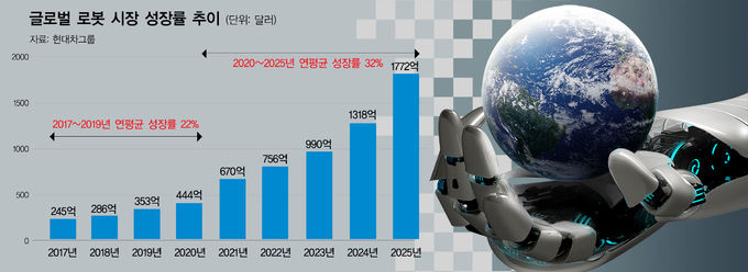 현대차그룹에 따르면 지난 2017년 245억 달러 수준의 세계 로봇 시장은 연평균 성장률(CAGR) 22%를 기록, 올해 444억 달러 수준으로 커질 전망이다. 코로나19 팬데믹에 의한 경제·사회적 패러다임 전환으로 올해부터 오는 2025년까지는 32%의 높은 연평균 성장률을 기록해 1772억 달러 규모로 시장이 성장할 것으로 예측된다.
