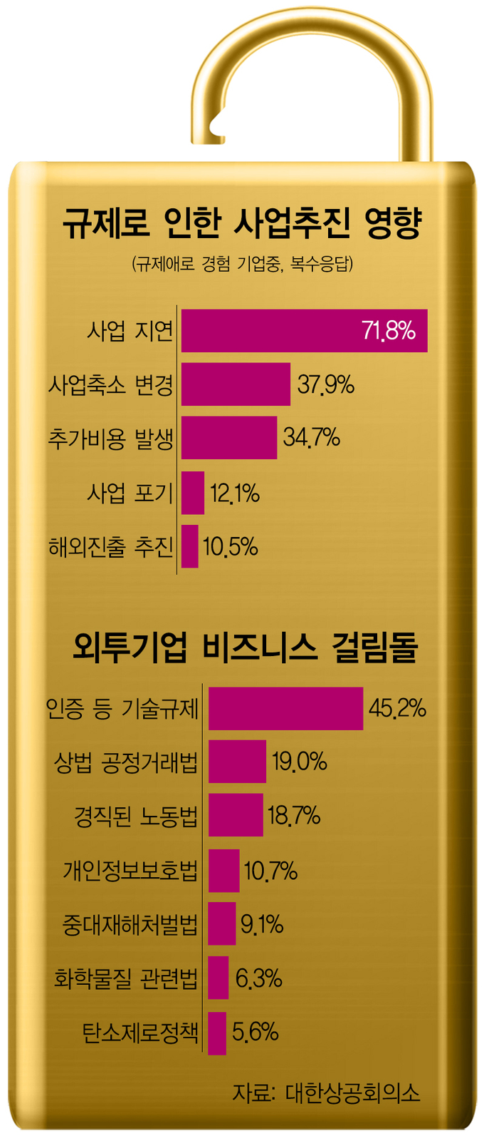 이들 기업은 규제로 인해 ‘사업축소·변경’(37.9%), ‘추가비용 발생’(34.7%) 등의 문제도 겪었고 아예 사업을 포기했다는 응답도 12.1%를 차지했다.