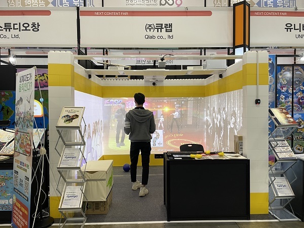 이번 넥스트콘텐츠페어 행사에서는 ㈜큐랩에서 퍼블리싱하는 제품들도 함께 시연 및 전시 중이다. ㈜엔트로스(대표 이창훈)의 AR/VR 스포에듀엔터테인먼트 콘텐츠 ‘에듀짐’은 실내 스포츠실 콘텐츠로 유치원생부터 초등학생에 이르기까지 실내에서 숫자놀이, 외계인침공, 틀린 그림 찾기, 축구, 농구 등 다양한 체육교과를 즐기고 배울 수 있는 실내 종합활동 콘텐츠로 학교, 문화센터, 복지관 등 다양한 공공장소에 설치 및 체험이 가능하다고 업체 측은 설명했다.