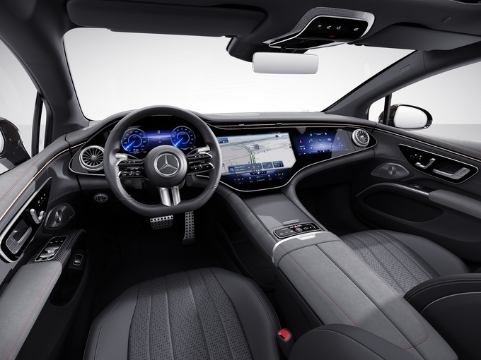 인테리어는 첨단 기술과 미래지향적인 요소가 조화를 이루는 럭셔리한 공간으로 탄생했다. 전체 계기반 패널이 하나의 와이드 스크린이 되는 MBUX 하이퍼스크린(MBUX Hyperscreen)은 더 뉴 EQS에 최초로 적용되었으며, 64가지 컬러 조명으로 원하는 스타일과 분위기를 연출하는 액티브 앰비언트 라이트(Active Ambient Light)와 함께 실내 전체의 시각적 미감을 완성해 준다.