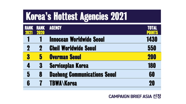 오버맨은 한국의 가장 핫한 광고회사 Korea’s Hottest Agencies 랭킹에서 지난해 5위로 Top 5에 진입했고, 올해는 2순위 상승해 대기업 계열 광고회사인 이노션(1430점) – 제일기획 (550점)에 이어 총점 200으로 3위에 올랐다.