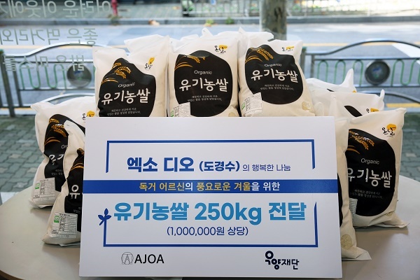 이에 아조아(AJOA)는 디오(도경수)의 이름으로 독거 어르신들이 풍요로운 겨울을 보내길 바라는 마음을 담아 우양재단에 250㎏ 상당의 유기농 쌀을 기부했다고 전했다. 우양재단으로 전달된 유기농 쌀은 추운 겨울을 홀로 보낼 독거 어르신들을 위해 배분될 예정이다.