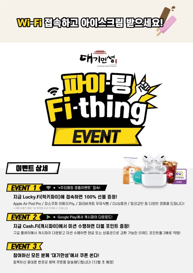 평택 및 인근 지역 대기만성 가맹점 3곳이 참여하는 이번 캠페인에서는 와이파이 접속을 통해 룰렛이벤트를 참여하면 다양한 경품을 100% 지급한다. 주문금액에 따라 대기만성에서 판매중인 아이스크림 디저트는 물론 에어팟, 밀크코인. 모바일 상품권 등 다양한 경품 당첨 기회가 주어진다.