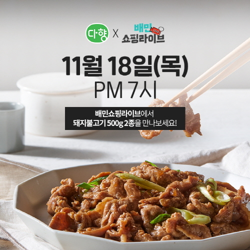 ‘다향X배민쇼핑라이브’는 18일 오후 7시 배달의 민족 앱 내 배민쇼핑라이브를 통해 한 시간 동안 방송될 예정이다. 다향은 이번 방송에서 국내산 돼지고기를 얇게 슬라이스해 양념한 ‘다향 돼지불고기’ 세트 구성을 33% 할인된 가격으로 선보인다고 전했다.
