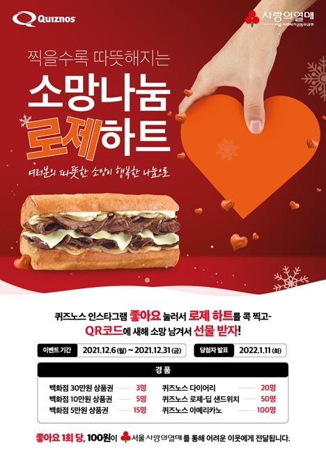 [세계비즈=박보라 기자] 글로벌 프리미엄 샌드위치 브랜드 퀴즈노스가 겨울을 맞아 서울 사회복지공동모금회(서울 사랑의열매)와 ‘소망나눔 로제하트’ 이벤트를 진행한다고 7일 밝혔다.