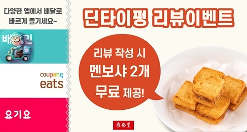 딘타이펑은 배달 오픈 이래로 꾸준히 리뷰 이벤트를 실시 중으로 이번 리뷰 이벤트에서는 가장 인기가 많은 사이드 메뉴인 멘보샤를 증정한다는 것이 업체의 설명이다.