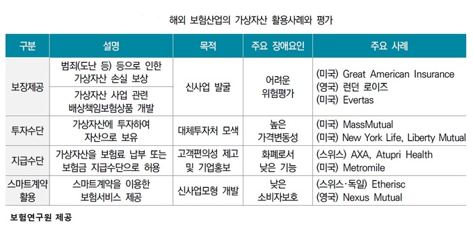 해외 보험 산업에서 가상자산이 활용되는 방식은 대표적으로 ▲보장 제공 ▲투자 수단 ▲지급 수단 ▲스마트계약 활용 등이다.