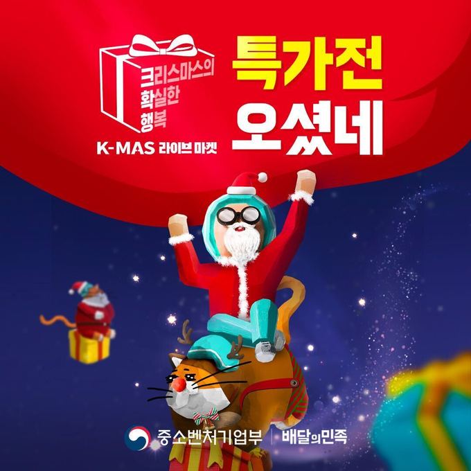 배민쇼핑라이브에서는 K-MAS 라이브 마켓 맞이 특별 방송을 준비했다. 18일, 22일, 24일, 25일 오후 5시와 6시에 각각 진행되는 특별 라이브 방송에서는 다양한 신선식품과 가공식품을 할인 판매한다. 18일 오후 5시 방송예정인 ‘삼삼푸드 통영 생굴(1kg)’은 25% 할인한 2만4500원, 22일 오후 6시엔 ‘식탁생활 꼬치어묵(270g, 4팩)’을 25% 할인한 1만1900원에, 25일 오후 5시엔 ‘오바로이 포기김치(3kg)’ 를 27% 할인한 1만4500원에 라이브로 판매한다.