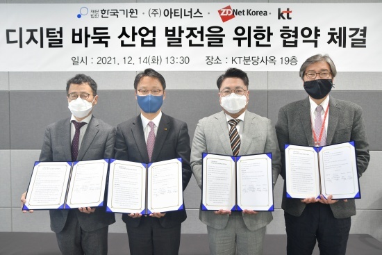 업체 측에 의하면 이를 위해 KT(대표이사 구현모)는 한국기원(총재 임채정), 지디넷코리아(대표이사 김경묵), 아티너스(대표이사 정철현)와 지난 14일 오후 KT 분당사옥에서 KT 강남서부법인고객본부장 성원제 상무, 한국기원 양재호 사무총장, 지디넷코리아 이균성 국장, 아티너스 정철현 대표이사가 참석한 가운데 디지털 바둑산업 발전을 위한 업무협약(MOU)을 체결했다.