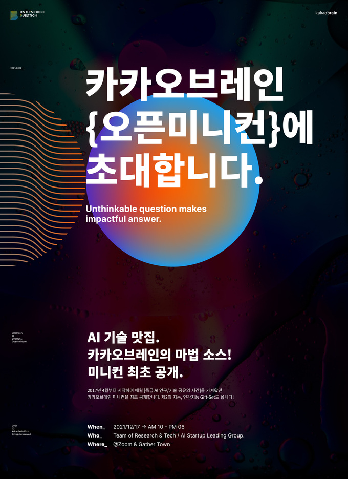 모든 세션이 종료된 후, 김일두 대표는 직접 내년 회사 비전과 방향을 직접 설명하는 ‘커티스(김일두 대표의 영이이름)톡’도 진행했다. 그 동안 생각하지 못했던 질문을 던져 세상을 변화시켜보자는 카카오브레인의 비전 ‘언띵커블 퀘스쳔(Unthinkable Question)’을 주제로 초거대 AI 연구의 중요성을 다시 한번 강조했다.