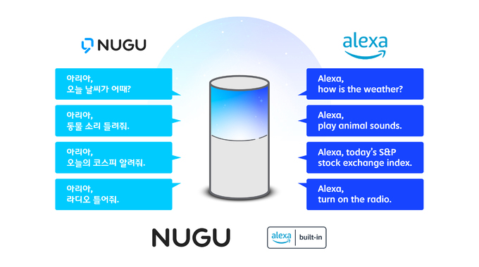 한국어 AI 호출어인 ‘아리아’를 부르면 ‘누구’를 통해 한국어 서비스 및 한국 콘텐츠를, 영어 AI 호출어인 ‘알렉사’를 부르면 ‘Alexa’를 통해 영어 서비스 및 해외 콘텐츠를 이용하는 방식이다.
