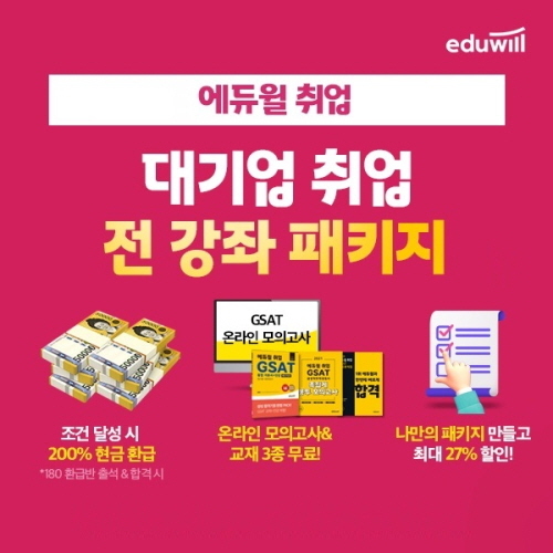 [세계비즈=박혜선 기자] 에듀윌(대표 이중현)이 ‘대기업 취업 전 강좌 0원 패키지’를 리뉴얼 오픈했다고 21일 밝혔다.