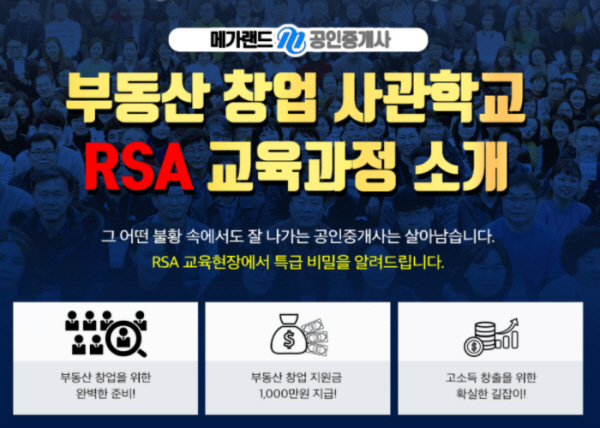 [세계비즈=황지혜 기자] 메가랜드가 공인중개사를 대상으로 부동산 창업 사관학교 RSA과정을 개강하고 신규 수강생을 모집한다고 22일 밝혔다.