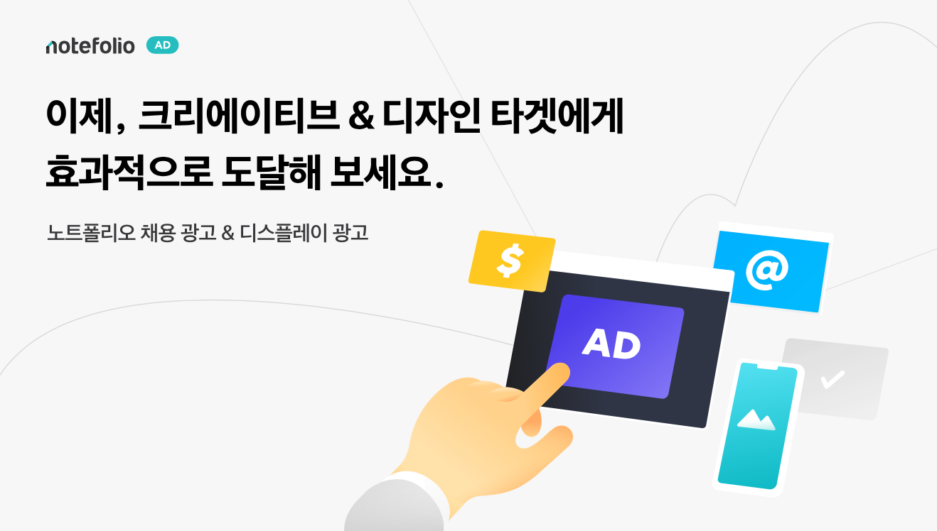 디스플레이 광고 상품은 ‘상단 띠배너 광고’와 ‘콘텐츠 디스플레이 광고’, 그리고 ‘eDM 광고’ 등으로 구성된다. 노트폴리오 웹/앱 최상단에 노출되고, 9만 창작자에게 소식을 전달할 수 있다. 특히 디스플레이 광고는 이미 2017년 삼성, 폭스바겐 등의 유명 기업이 공모전을 진행하며 노트폴리오와 협업, 유의미한 성과를 낸 바 있어 광고 상품으로까지 출시됐다. 향후 디자인 분야에 관심이 높은 잠재고객에게 효과적으로 다가갈 수 있는 광고 상품이 될 것으로 기대하고 있다.