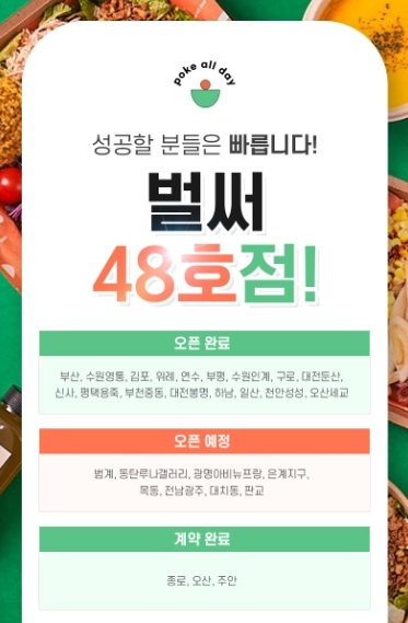프랜차이즈 창업 브랜드 포케올데이는 하와이안 샐러드인 ‘포케’를 주력으로 다루는 브랜드로 2020년 10월에 송도에서 본점을 론칭하였으며 14개월만에 48호점까지 계약을 완료했다고 밝혔다.