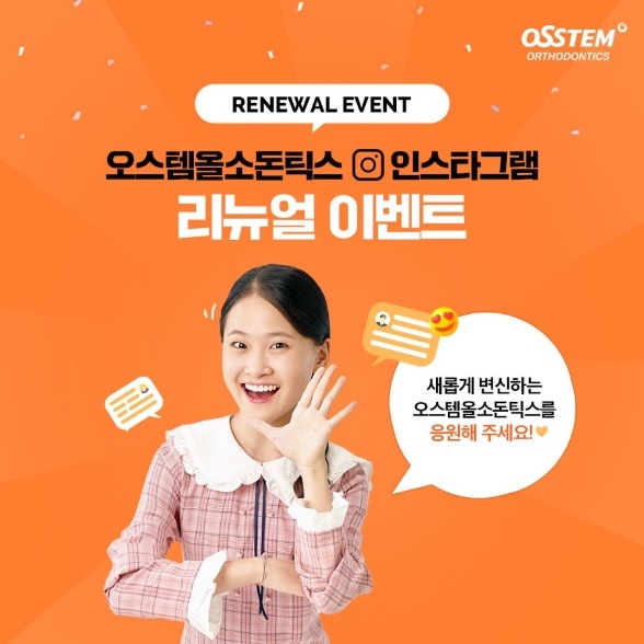 회사 측은 신규 광고 모델 발탁 및 인스타그램 채널 리뉴얼을 기념, 이달 말일까지 SNS댓글 이벤트를 진행한다. 오스템올소돈틱스 공식 인스타그램 채널을 팔로우하고, 해당 이벤트 게시글에 응원 메시지를 댓글로 등록하면 자동으로 이벤트 응모가 된다.
