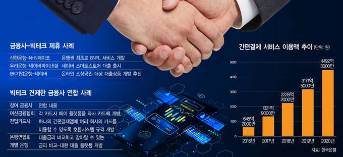 30일 금융권에 따르면 최근 주요 은행들은 빅테크들과 금융상품 공동개발, 디지털혁신 추진 등 전략적 협업을 펼치고 있다. 그간 은행들은 소비자에 대한 빅테크의 영향력 확대를 달가워하지 않았다. 빅테크가 ‘사실상’ 금융업을 영위하면서도 낮은 수준의 규제를 받고 있다는 이유에서다. 금융당국이 추진한 빅테크 중심의 대환대출 플랫폼에 대해서 은행권이 일제히 반발한 점도 비슷한 사례다. 하지만 은행들은 스스로 규모의 경제를 달성하기 어려운 상황에서 소비자 확보, 디지털 혁신 등의 목적 달성을 위해 빅테크와 손을 잡았다.