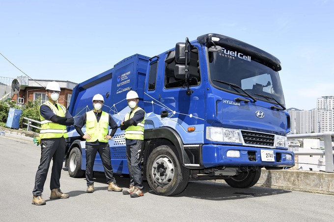 이날 공개된 영상에 등장하는 수소청소트럭은 연료전지 시스템과 수소탱크 등을 기존의 청소트럭에 맞게 설계를 최적화한 모델로서 2021년 1월부터 경상남도 창원시의 환경 미화 작업에 투입되어 실증 운행을 진행해왔다.