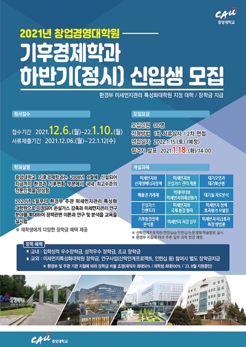 [세계비즈=박보라 기자] 중앙대학교 창업경영대학원 기후경제학과가 2022학년도 신입생 정시 모집을 실시한다고 31일 밝혔다.