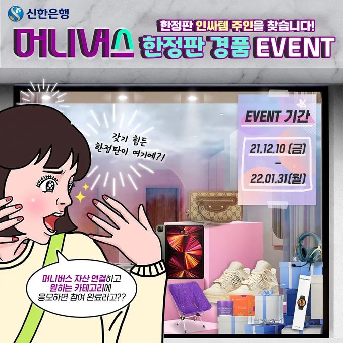 신한은행은 오는 31일까지 자사 마이데이터 브랜드 ‘머니버스’에 가입하고 자산을 연결한 후 패션·뷰티, 테크, 취미 카테고리 중 하나를 선택해 응모한 가입자를 대상으로 구찌 지갑, 나이키 한정판 스니커즈, 아이패드 프로, 갤럭시 워치 PXG에디션, 로지텍 롤 에디션 등을 제공하는 경품 추첨 이벤트를 진행한다.