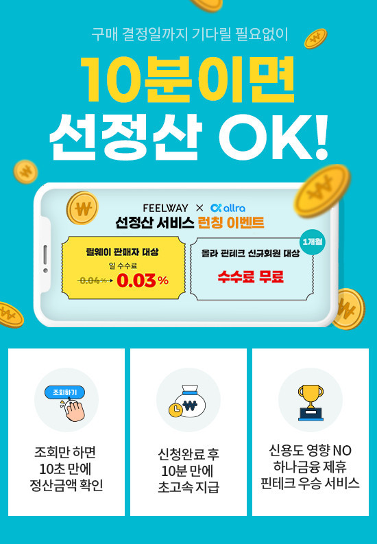 한편, 필웨이는 선정산 서비스 런칭 이벤트를 제공한다. 올라 핀테크의 선정산 서비스 신규 회원을 대상으로 첫 달 수수료 무료 혜택을 제공하고, 필웨이 판매자에 한해 선정산 기본 일수수료를 0.03%로 낮춘다고 덧붙였다.