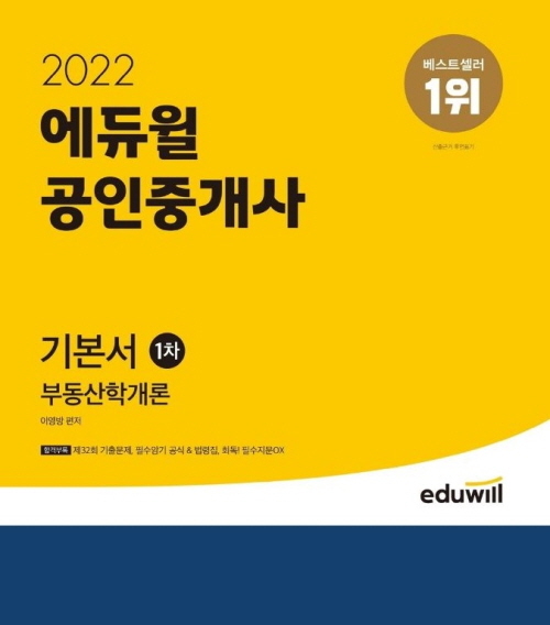 [세계비즈=이경하 기자] 종합교육기업 에듀윌(대표 이중현) 공인중개사는 '2022 에듀윌 공인중개사 1차 기본서 부동산학개론’ 교재가 온라인서점 YES24 공인중개사 부문에서 1월 월별 베스트셀러 1위에 올랐다고 7일 밝혔다.