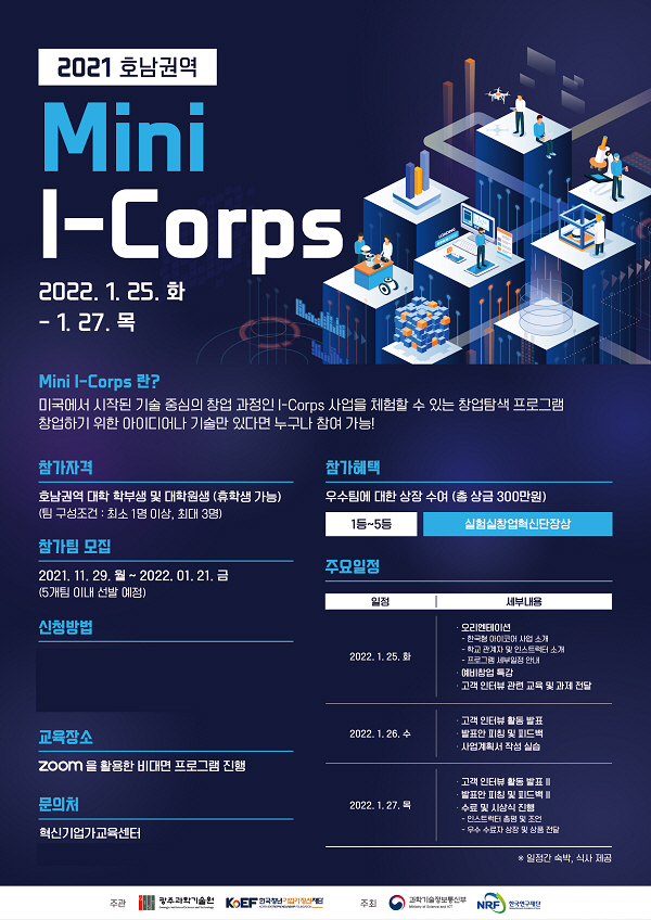 한편 2021 호남권역 Mini I-Corps 프로그램은 오는 25일부터 27일까지 Zoom을 활용한 비대면으로 진행된다. 참가팀은 오는 21일까지 구글폼으로 모집하며, 관련 사항은 광주과학기술원 실험실창업혁신단에 문의, 또는 구글폼으로 신청하면 된다.