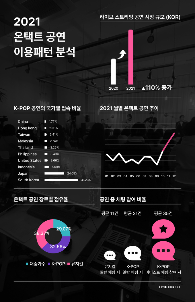 라이브커넥트는 2021년 라이브 스트리밍 공연 송출의 전체적인 시장규모는 전년도 하반기의 동 기간 대비 110% 가량 증가했으며, K-POP 아티스트들의 글로벌 팬덤의 영향으로 169개 국가에서 한국의 온라인 공연을 감상했다고 전했다.
