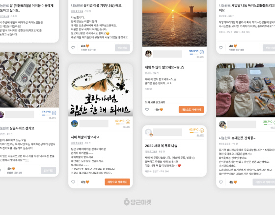 특히 2022년 새해 첫날부터 당근마켓에 이웃에게 새해 복을 나눔하겠다는 정겨운 글들이 올라오고 있어 눈길을 끈다. 신년 인사의 정형처럼 느껴지는 ‘새해 복 많이 받으세요’라는 표현을 이용자들이 당근마켓만의 나눔 문화를 활용해 재치 있게 풀어낸 것이다. 내 이웃의 올 한 해 건강과 행복을 기원하며, 새해 덕담을 주고받는 당근마켓은 연일 이어지는 강추위를 녹일 만큼 훈훈한 분위기를 자아내고 있다.