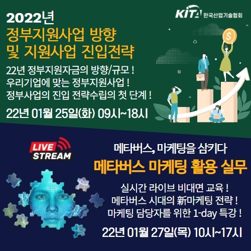 [세계비즈=황지혜 기자] 한국산업기술협회(회장 신영의)는 오는 25일, 27일 양일간 2022년 정부지원사업 운영 방향 및 지원사업 진입 전략과 메타버스 마케팅 활용 실무 1-day 특강을 각각 개최한다고 17일 밝혔다.