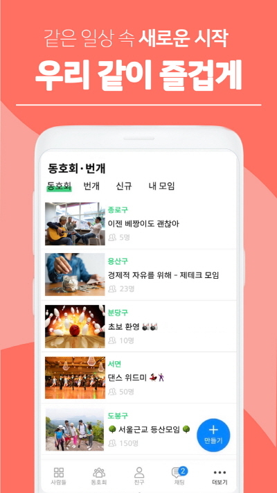 이 앱은 단순히 주변에 이용자들을 탐색하고 연락을 취할 수 있도록 하는 지역커뮤니티만이 아니라 동호회도 찾을 수 있도록 서비스를 제공한다.