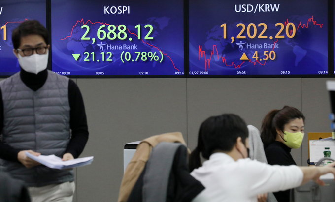 코스피가 장중 2700포인트 아래로 떨어진 것은 지난 2020년 12월 3일(장중 2672.85, 종가 2696.22) 이후 13개월여 만이다.