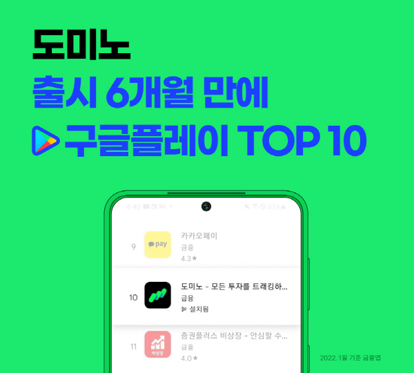 [세계비즈=박혜선 기자] 투자관리앱 ‘도미노’가 출시 6개월만에 구글플레이 금융앱 부문 인기 랭킹 10위에 진입했다고 4일 밝혔다.