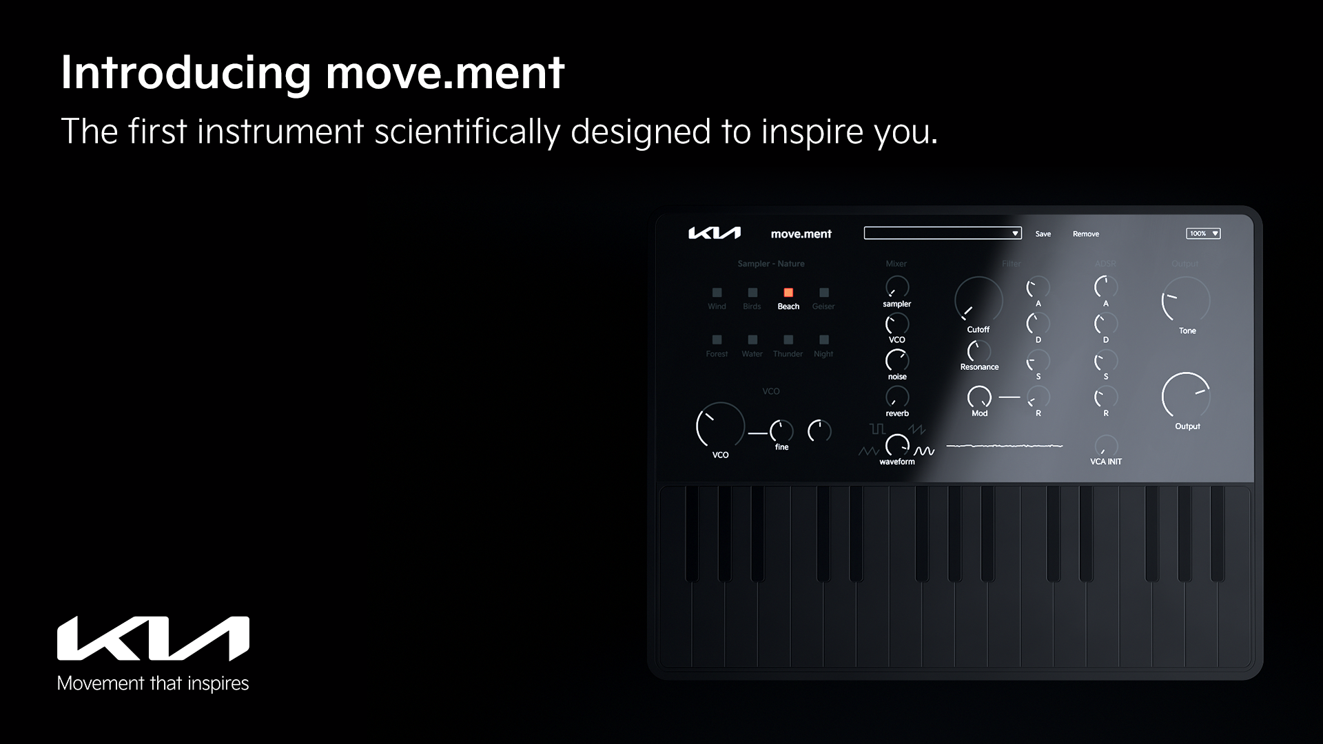 24일 기아에 따르면 이번에 공개된 'move.ment'는 누구나 쉽게 음악을 만들어 볼 수 있는 디지털 악기로, 기아의 가장 큰 영감의 원천인 '자연'의 소리를 활용해 만든 음악과 사운드 등을 통해 고객에게 많은 영감과 창의성을 불러일으킬 수 있는 기회를 제공하고자 마련하게 됐다.