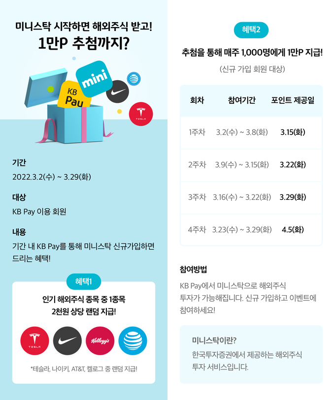 나아가 KB국민카드는 KB Pay 해외주식투자 서비스 출시를 기념해 오는 29일까지 KB Pay를 통해 미니스탁 서비스에 가입한 고객에게 매주 추첨을 통해 총 4000명에게 1만 포인트리를 제공하는 이벤트를 진행한다. 또 한국투자증권에서 주식 계좌를 처음 개설한 고객은 ▲스타벅스 ▲화이자 ▲애플 ▲코카콜라 중 원하는 종목으로 5000원 상당의 주식을 소수점 단위로 제공받는다. 미니스탁 신규 가입자는 추가로 2000원 상당의 랜덤 해외주식(테슬라, 나이키, AT&T, 켈로그 중 1종목)을 받을 수 있다.